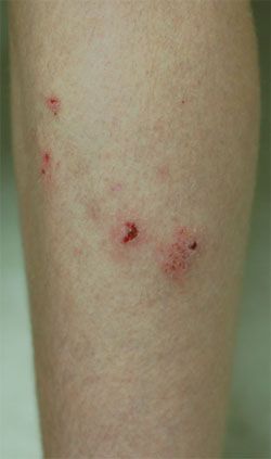 For the past year, a 15-year-old boy has had a pruritic eruption on his shins. His mother suspects that his soccer shin guards are the cause; however, he wears them over his socks. Topical corticosteroids have not been effective.