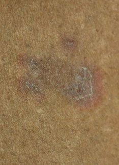 For a few months, a 51-year-old woman has had an asymptomatic rash on her proximal thighs. She claims to have no other rashes and denies any exposure history.