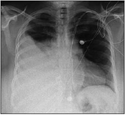 Physical examination revealed an obese woman with markedly decreased air entry over the mid and lower right hemithorax. A chest radiograph (Figure 1) and a CT scan showed a large right-sided pleural effusion with atelectasis of the right lower lobe.