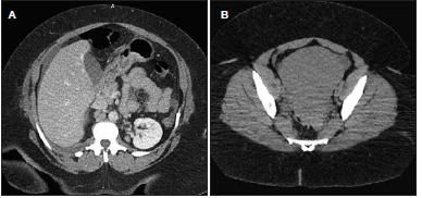 Figure 2 – Perihepatic ascites on the chest CT scan suggested an abdominal pathology (A). A CT scan of the abdomen revealed a large pelvic mass anterior to the uterus (B).