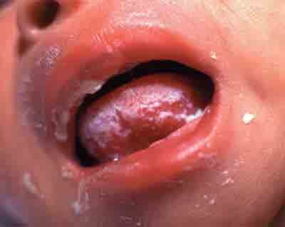 A 46-year-old woman presented with a history of 7 days of productive yellow-green sputum and subjective fevers, chills, and nocturnal sweats. She complained of right-sided, pleuritic chest pain; dyspnea; and myalgia and had lost 60 lb during the previous 6 months. She had HIV infection. Candidal infection (thrush), shown here, is an oral lesion often found with later-stage chronic HIV infection.