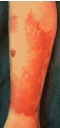 This rash in the pretibial area was noted in a 44-year-old man with suspected streptococcal toxic shock syndrome (TSS). TSS caused by group A streptococcus (GAS), or Streptococcus pyogenes, stems from severe, invasive infections, such as bacteremia, pneumonia, necrotizing fasciitis, and spontaneous gangrenous myositis, and is associated with acute onset of shock and organ failure.