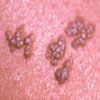 Common warts are flesh-colored and characterized by reddish brown dots on a vegetated surface. They arise on sites of trauma; knees, fingers, and hands are frequent locations. Lichen striatus is a self-limited, asymptomatic eruption that usually extends distally on one limb and spontaneously clears in 1 to 2 years. Seborrheic keratoses are scattered and discrete and rarely occur in persons younger than age 30 years. Lichen planus lesions may manifest in a linear pattern (Koebner phenomenon); however, it is unlikely for this condition to develop in a young child and as an isolated group of lesions.