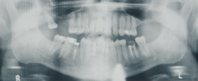 Panoramic imaging shows the root canal in teeth 29 and 30 and endodontic therapy in teeth 19 and 29. Tooth 19 has crown breakdown and inadequate fill. Teeth 2 and 3 are missing (Figure 2, left). The findings on MRI and CT imaging were normal.