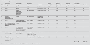 Most patients’ HIV disease was well controlled, with 7 of the 9 patients having undetectable viral loads at the start of their anticoagulation therapy. In 5 of the 9 patients, adherence to the antiretroviral regimen was documented as “100%” as assessed by their clinician. Six of the patients had a CD4+ cell count above 300/µL. There was no clinically significant change in the patients’ CD4 counts or viral loads during the first 6 months of anticoagulation treatment.