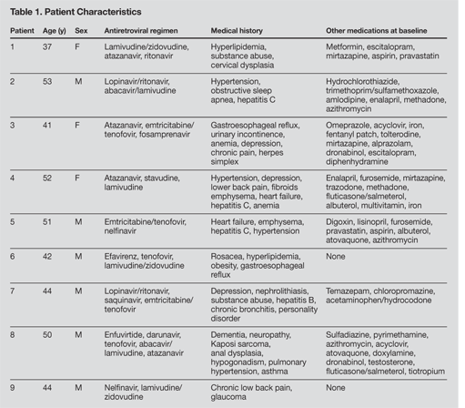 Twelve patients who had been taking both warfarin and antiretrovirals during the previous 2 years were identified. Two patients were excluded because they had abnormal INRs and were being monitored at a separate clinic, and a third patient was excluded because her anticoagulation therapy was discontinued as a result of long-term nonadherence. Of the 9 remaining patients, the mean age was 47 years. All but one were receiving PI-based antiretroviral therapy, with 3 receiving a ritonavir-boosted regimen. All patients had a goal INR of 2.0 to 3.0. Indications for anticoagulation included antiphospholipid antibody (1 patient), pulmonary embolism (1 patient), deep venous thrombosis (6 patients), and pulmonary embolism and deep venous thrombosis (1 patient). The complexity of the clinical situation for each of these patients is illustrated in Table 1, which provides the patients’ medical histories and concurrent medications.