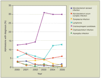 Among HIV-related diagnoses (Figure 3), there was significant rise in the number of patients admitted with lymphoma and oral/esophageal candidiasis and a significant decline in admissions involving infection with Cryptosporidium, Mycobacterium kansasii, Mycobacterium avium complex, and Aspergillus. These changes may reflect a continued high prevalence of early opportunistic infections and a decline in traditionally late opportunistic infections.