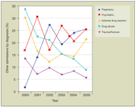 Pregnant HIV-infected women tended to be admitted to the obstetrics service and were not included in our database until after June 2001. Their addition to the database after June 2001 can mostly explain the rise in other admissions. However, it should be noted that there was also a rise in psychiatric admissions and adverse reactions to medications (Figure 6).