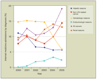 As noted earlier, there has been a rise in admissions with internal medicine diagnoses. Specifically, we have seen a rise in admissions for renal and endocrine diagnoses as well as a rise in admissions for non–HIV-associated malignancies. There has been a decline in admissions for hematological and hepatic reasons (Figure 5). The rise in renal-related admissions occurred despite a drop in admissions among African Americans. Yet, in the African American population, there was a significant increase in admissions for renal issues vers