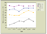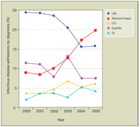 Among infectious disease–related admissions (Figure 4), there has been no change in the total number of non–HIV-associated infectious diseases. However, there have been striking changes in the types of infections reported. Since 2002, there was a decline in admitted patients with upper respiratory tract infections. This may reflect changes in admissions since the new hospital opened in December 2002. Because of the smaller number of beds in the new hospital, patients who present to the emergency department with non-severe symptoms are monitored in a 23-hour observation area of the emergency department and may not be admitted. This area was not available in the old hospital, and these patients were more likely admitted. Therefore, patients presenting with an upper respiratory tract infection were less likely to be admitted in the new hospital. There has also been a significant rise in skin and soft tissue infections among our population. This appears to be coincidental with the outbreak of community-acquired methicillin resis tant Staphylococcus aureus (CA-MRSA) infections we have been seeing in our hospital.