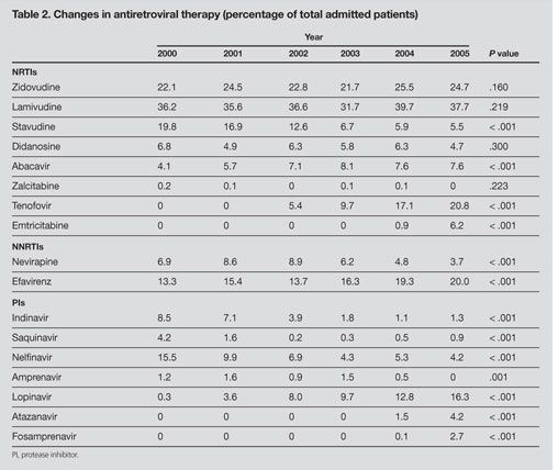 As noted in Table 1, there was no significant change in the overall use of highly active antiretroviral therapy. However, there have been dramatic changes in the medications used, including significant declines in the utilization of stavudine, indinavir, nelfinavir, saquinivir, and nevirapine and an increased utilization of abacavir, tenofovir, efavirenz, lopinavir/ ritonavir, and newer agents such as atazanavir, fosamprenavir, and emtricitabine (Table 2). These changes may reflect movement away from older antiretroviral agents because of short- or long-term toxicity or because newer coformulations facilitate medication adherence by decreasing pill burden and frequency.