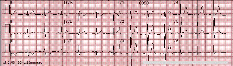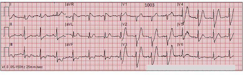 A 47-year-old man with no previous medical history called 911 complaining of chest pain; EMS treated the patient with aspirin and sublingual nitrates and obtained an ECG (Figure1) at 9:50 am. He was transported emergently to the emergency department (ED) with chest pain described as an aching sensation. The pain was associated with nausea, dyspnea, and diaphoresis and had begun intermittently approximately 5 hours before the 911 call that morning. On ED arrival, the patient was ill-appearing with significant diaphoresis. The examination was otherwise unremarkable. An ECG (Figure 2) was obtained at 10:03 am while management continued.