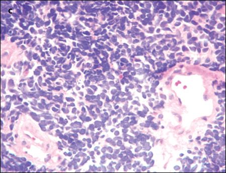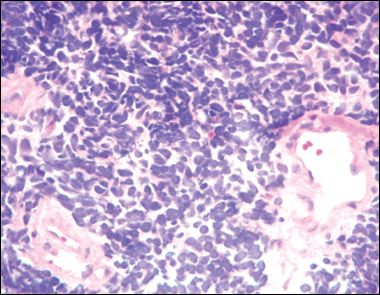 The patient then underwent a diagnostic bronchoscopy and a biopsy of the lung mass. The lung mass biopsy demonstrated small-cell lung carcinoma; immunohistochemical stains were positive for the neuroendocrine markers AE1/AE3, CAM5.2, cytokeratin 7 (CK7), thyroid transcription factor-1 (TTF-1), synaptophysin, chromogranin A, and CD 56.