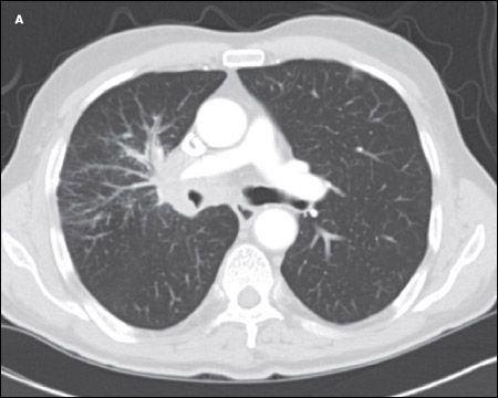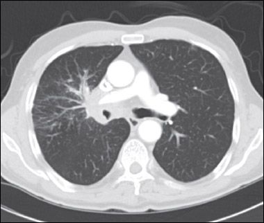 Temperature was 36.8°C (98.3°F); heart rate, 86 beats per minute; respiration rate, 24 breaths per minute; and blood pressure, 120/70 mm Hg. Oxygen saturation was 98% on 2 liters of oxygen. Oral thrush was evident. There was no palpable lymphadenopathy. Heart rhythm was irregular with a loud P2; there were no appreciable murmurs. Chest examination showed diffuse bilateral wheezes and dullness to percussion at both lung bases. There was no palpable hepatomegaly or splenomegaly. No pedal edema was noted. Results of a neurological examination were nonfocal.