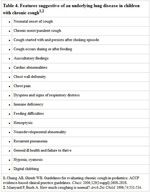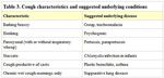 The quality of cough may indicate a specific diagnosis. Table 3 presents the characteristics of classic types of cough and the probable underlying disease. Important clinical features that point to a serious underlying disease process are listed in Table 4.