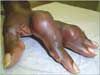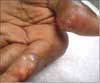 These joint deformities occurred in a 61-year-old man with chronic tophaceous gout. The patient had had joint pain and swelling since he was 40 years old; the symptoms began in 2 fingers and were initially mild. He did not seek medical attention. Within 5 to 10 years, joint abnormalities had developed in the fingers and then in the left elbow and right ankle. The toes were not affected. He had no family history of joint pain or swelling. Serum uric acid level was 9.7 mg/dL.