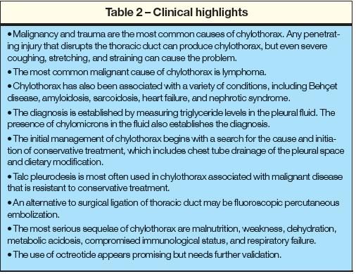 In 1948, Lampson2 reported the first successful treatment of chylothorax by supradiaphragmatic ligation of the thoracic duct. Although chylothorax accounts for a small proportion of pleural effusions, prompt recognition is needed to avoid malnutrition and to prevent immunodeficiency.