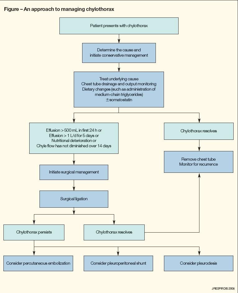 ABSTRACT: The most common causes of chylothorax are neoplasm-particularly lymphoma-and trauma. The usual presentingsymptom is dyspnea resulting from the accumulationof pleural fluid. The diagnosis of chylothorax is established bymeasuring triglyceride levels in the pleural fluid; a triglyceridelevel of greater than 110 mg/dL supports the diagnosis. The initialapproach to management involves chest tube drainage ofthe pleural space. The administration of medium-chain triglyceridesas a source of fat is often useful. If drainage remains unchanged,parenteral alimentation should be started. Surgicalintervention is indicated if conservative management is notsuccessful or if nutritional deterioration is imminent. If chylothoraxpersists after ligation of the thoracic duct, options mayinclude percutaneous embolization, pleuroperitoneal shunt,and pleurodesis. (J Respir Dis. 2008;29(8):325-333)
