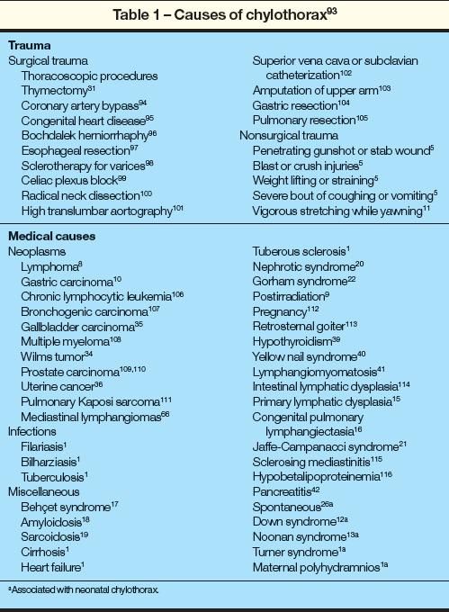 There are numerous causes of chylothorax.93 The cause should be ascertained because treatment will be tailored accordingly. Other considerations include nutritional status, severity of the underlying disease, and proper delineation of the thoracic duct anatomy in the planning of the treatment. When conservative management fails, appropriate surgical intervention or percutaneousembolization must be considered.