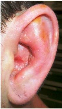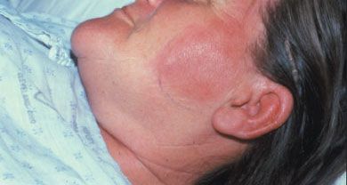 This example of facial erysipelas shows an indurated and erythematous lesion that might be mistaken for cellulitis.