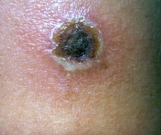 A young man sought medical attention after a motorcycle mishap that led to multiple leg abrasions. One such lesion (shown here) expanded rapidly and became progressively painful. The center of the lesion turned dark. The black, hard center represents an eschar.