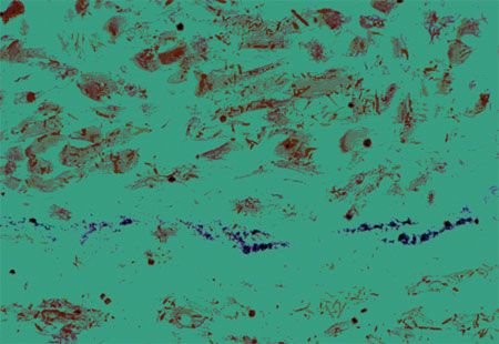 A sample of muscle tissue from a patient with group A streptococcal (GAS) necrotizing fasciitis/myonecrosis shows an abundance of gram-positive cocci and extensive muscle destruction. The patient was a 65-year-old man in whom toxic shock syndrome (TSS) developed. TSS caused by GAS stems from severe, invasive infections.