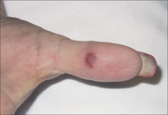 The signs and symptoms seen in the 34 patients were similar to those typically reported for WNV infections.2 Two patients with atypical presentations stood out in our patient population. The first case was that of a 49-year-old woman who presented with fever and arthralgia. She did not experience headache or other neurological symptoms. She had scattered, tender skin lesions suggestive of septic emboli and a lesion on her thumb that was consistent with an Osler node (Figure 2). Her physical examination demonstrated a symmetrical, polyarticular arthritis. She did not have a cardiac murmur, but a presumptive diagnosis of endocarditis was made during the initial examination. She had an extensive workup while in the hospital that included blood cultures and a transesophageal echocardiogram, the results of which were negative.