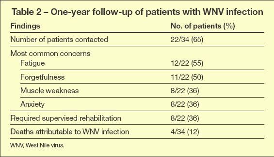 Approximately 12 months following the 2004 WNV outbreak, an attempt was made to contact the 34 patients by telephone. We were able to obtain follow-up information on 22 patients (65%), although we did acquire information on mortality in relation to the whole group. The results are summarized in Table 2. Fatigue, forgetfulness, muscle weakness, and anxiety were the main residual problems that persisted at 1- year follow-up. Four deaths (12%) attributable to WNV occurred, and at least 8 patients (36%) required inpatient rehabilitation at a skilled nursing facility or outpatient visits for physical therapy.