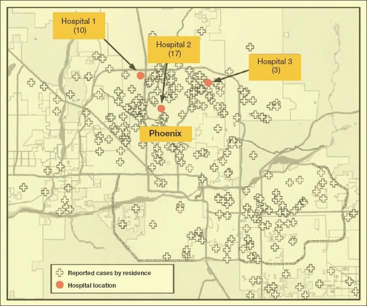 West Nile virus (WNV) is a mosquito-borne virus that first appeared in North America in New York City in 1999.1 Since then, the virus has spread across the United States, causing disease in virtually every state. Arizona experienced its first cases-15 total-in 2003. In 2004, the number of proven cases increased to 391 (Craig Levy, personal communication, from the Arizona Department of Health Services, Vector-Borne and Zoonotic Diseases Program, October 4, 2005). The more than 25-fold increase in cases in 2004 was unexpected, given the hot and dry climate of Phoenix where the majority of cases occurred. We report on 34 cases that were treated in 3 community hospitals. About 68% (265 of 391) of cases of WNV infection seen in Arizona in 2004 were clustered around these 3 hospitals in metropolitan Phoenix (Figure 1).