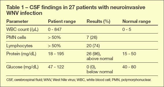 A lumbar puncture was performed in 27 of 28 patients (96%) with neuroinvasive disease. A summary of the CSF findings is given in Table 1. CSF specimens in the majority of patients (74%) demonstrated lymphocytic pleocytosis. Seven of 27 patients (26%) had CSF white blood cell pleocytosis with greater than 50% predominance of polymorphonuclear leukocytes. This initially raised suspicion of a bacterial infection; however, subsequent tests confirmed WNV infection.