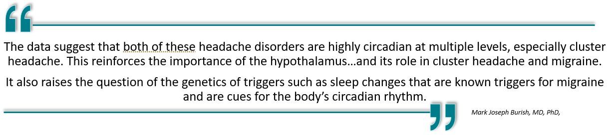 “The data suggest that both of these headache disorders are highly circadian at multiple levels, especially cluster headache,” said study author Mark Joseph Burish, MD, PhD, of the University of Texas Health Science Center at Houston. “This reinforces the importance of the hypothalamus—the area of the brain that houses the primary biological clock—and its role in cluster headache and migraine. It also raises the question of the genetics of triggers such as sleep changes that are known triggers for migraine and are cues for the body’s circadian rhythm.”