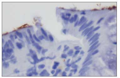 The patient’s gastroparesis was severe and unresponsive to promotility agents. Surgery was consulted for placement of a feeding jejunostomy tube. Because of the positive RPR titer and absence of any other etiology for the patient’s symptoms, we requested pathology to perform specific immunohistochemical staining (Biocare Medical, Concord, Calif) for Treponema on all GI biopsy specimens. The gastric biopsy specimens were negative for Treponema, but the rectal biopsy specimens were highly positive, showing luminal spirochetes and 1 tissue spirochete (Figure).