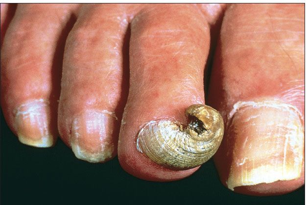 This “ram’s horn” toenail had been bizarrely curved for many years, according to a 65-year-old man. The accentuated curve in the thickened nail develops as one side of the nail grows faster than the other. Onychogryphosis most frequently occurs on the great toenail, less often on the other toenails; fingernails are rarely involved. The most common precipitating factor is injury to the nail matrix. Poorly fitting footwear, hallux valgus, onychomycosis, psoriasis, ichthyosis, diseases of the central and peripheral nervous systems, vascular disease, and even old age have all been associated with this problem; however, the cause is often not obvious.
