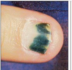 Green pigmentation appeared in the thumbnail of a nursery school worker whose hands were constantly in water. The discoloration resulted from a pseudomonal infection. The woman was advised to soak her thumb in acetic acid solution and limit immersion in water; these measures cleared the infection.