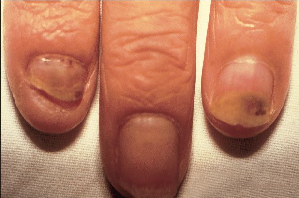 A 32-year-old teacher presented with a 6-month history of palpitations, weight loss, and heat intolerance. For the past 3 months, he had also noticed that his fingernails were separating from their beds and turning white at their distal border. The condition was diagnosed as thyrotoxicosis, a common cause of onycholysis. The nail plate’s separation from the terminal epidermal nail bed is evidenced by its change in light reflection; hence, the opaque, whitish color.