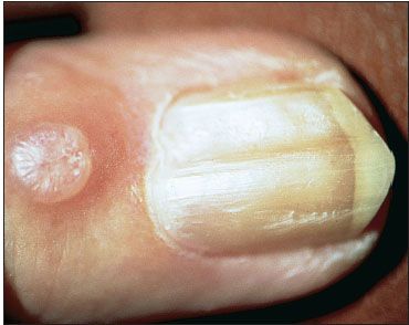 This synovial (myxoid) cyst lies close to the proximal nail fold. Such cysts exert downward pressure on the nail-producing cells, which results in a grooved nail. Treatment measures include deep excision; evacuation by puncturing, then replacing the gelatinous fluid with triamcinolone; and injection of triamcinolone around the cyst rather than into it. Success has been reported with each type of treatment, but recurrences are common.