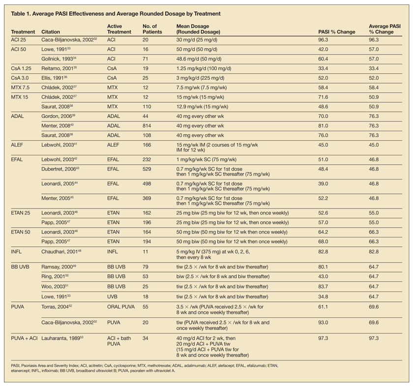 Thus, 22 studies qualified for inclusion in the meta-analysis. Table 1 shows the final studies selected and their number of patients, dosages, and reported effectiveness. When more than 1 study pertained to a given treatment, the weighted (by total number of patients) average percentage change in PASI was calculated.