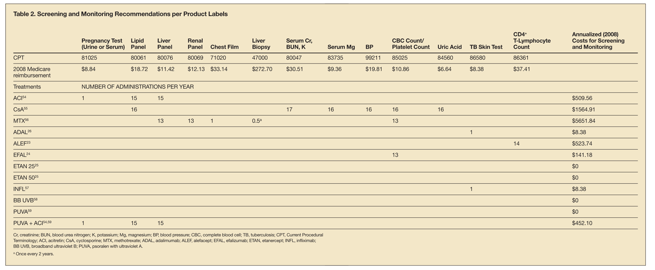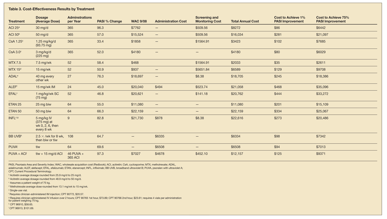 Where appropriate, total annualized costs included drug acquisition at the wholesale acquisition cost (WAC); clinical procedures, such as administration of intravenous infusion or administration of phototherapy at Medicare 2008 reimbursement rates; and screening and monitoring as recommended by the product label for drugs and in consensus statements for phototherapy at Medicare 2008 reimbursement rates. For systemic biologic medications that required clinician-administered procedures, such as alefacept intramuscular injection and infliximab intravenous infusion over 2 hours, the costs at Medicare 2008 reimbursement rates were included in total costs; all other systemic biologic agents were assumed to be patient-administered.