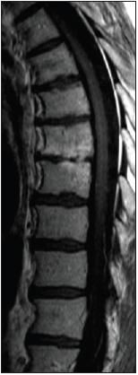 T1-weightedgadolidium-enhancedMRI of the thoracicspine showingspondylodiscitis atthe level of T7-8.
