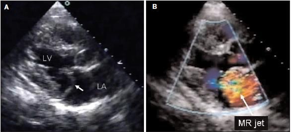 (A) The arrow in this transthoracic ECG points to the flail posterior mitral leaflet. (B) The arrow in this transthoracic ECG withDoppler flow indicates mitral regurgitation into the left atrium. (LV, left ventricle; LA, left atrium.) (Images courtesy of Natesa Pandian, MD.)