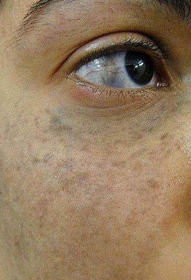 A 24-year-old woman presents for evaluation of a pigmented area on her face, present since birth. The area is asymptomatic, and the patient is mostly curious about cosmetic improvement. The cutaneous and scleral blue-gray pigmentation in the distribution of the ophthalmic and/or maxillary branches of the trigeminal nerve seen here is known as nevus of Ota, a benign dermal melanocytosis.