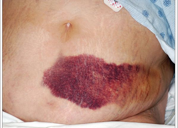 A 77-year-old woman had shortness of breath that worsened when she was supine and intermittent left flank pain. She had a history of an embolic cerebral stroke, for which she takes warfarin. There is a large abdominal ecchymotic mass over the left side. She had fallen in her bathroom a few days earlier.