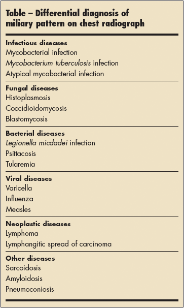 The differential diagnosis of a miliary pattern on a chest radiograph is broad (Table).1 Nontuberculous causes may include any granulomatous or neoplastic disease. Small, well-demarcated lesions usually represent thickening of the interstitium of the lung. Lesions that are the same size are generally granulomas.