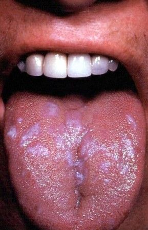 A 36-year-old man presents with the new onset of stinging and burning well-defined whitish plaques randomly scattered on the dorsum of the tongue.