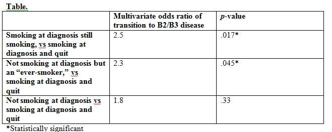 Controlling for disease-specific factors (severity, disease duration, terminal ileal and perianal disease, use of immunosuppressive agents or intravenous steroids), self-reported smoking behavior increased the risk of transition from B1 disease to B2 or B3. Three comparison groups were identified; the multivariate odds ratio quantifies the elevated risk of transition in the specified smoking cohort. (Table)