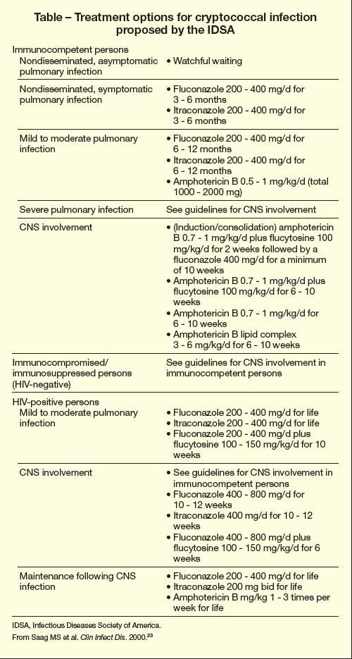 General guidelines for the treatment of cryptococcal infection, developed by the Infectious Diseases Society of America (IDSA) and published in 2000, are shown in the Table.23 (The document can be accessed at http://qcom.etsu.edu/intmed/divisions/ id/guidelines/Cryptococcal% 20infections.pdf).