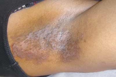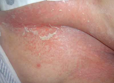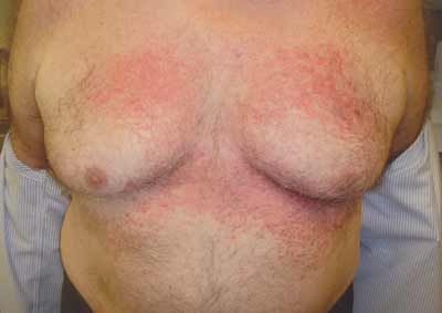 Candidiasis usually appears as well-defined erythema with slight scaling, often accompanied by satellite papules and pustules. It most commonly occurs in the axilla, the groin, under the pannus of the stomach of obese persons (Figure 1), and the inframammary areas and other regions of the torso (Figure 2). Cracking and maceration of the skin may be present.