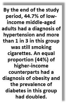 By the end of the study period, 44.7% of low-income middle-aged adults had a diagnosis of hypertension and more than 1 in 3 in this group was still smoking cigarettes. An equal proportion (44%) of higher-income counterparts had a diagnosis of obesity and the prevalence of diabetes in this group had doubled.
