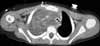 Antibiotic therapy was started. Because of increasing respiratory distress, the child underwent elective intubation and was admitted to the pediatric ICU. A CT scan of the neck and chest revealed a hypodense fluid collection with multiple septa extending from the retropharyngeal space into the mediastinum. There was significant compression of the trachea and thoracic vasculature. After the otolaryngologist and thoracic surgeon were consulted, the child underwent surgery. An infected cystic hygroma was found and excised.