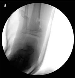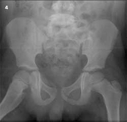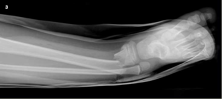 A 6-year-old boy was a passenger on an adult-sized ATV with his uncle. The ATV rolled over on both of them when the uncle lost control. The boy was wearing a chest protector at the time but no helmet. He sustained extensive injuries to both inguinal areas and to his mid-anterior thighs and lower legs. Figure 3 shows an angulated, displaced distal tibia as well as fibula fractures. CT scans and an anteroposterior radiograph of the pelvis (Figure 4) revealed bilateral nondisplaced pelvic bone fractures involving the right superior pubic ramus and bilateral inferior pubic rami. The open right tibia wound was extended surgically, irrigated copiously, and the fracture was reduced. Intravenous antibiotic therapy was administered for 48 hours. A drain was placed in the open wound, and the patient was placed in a long leg cast (Figure 5). The drain was removed in 2 days through an opening in the cast. The patient healed without complications.